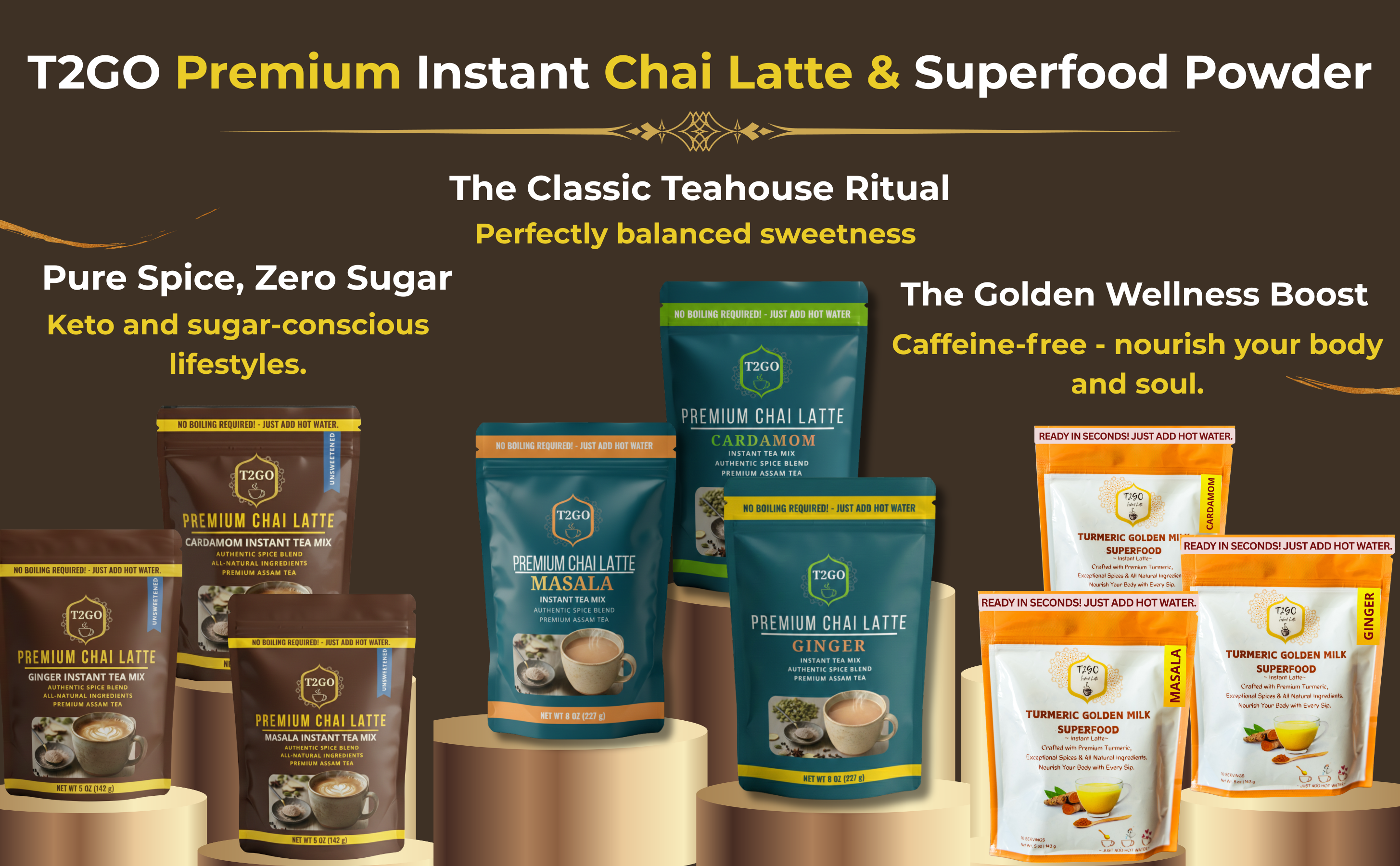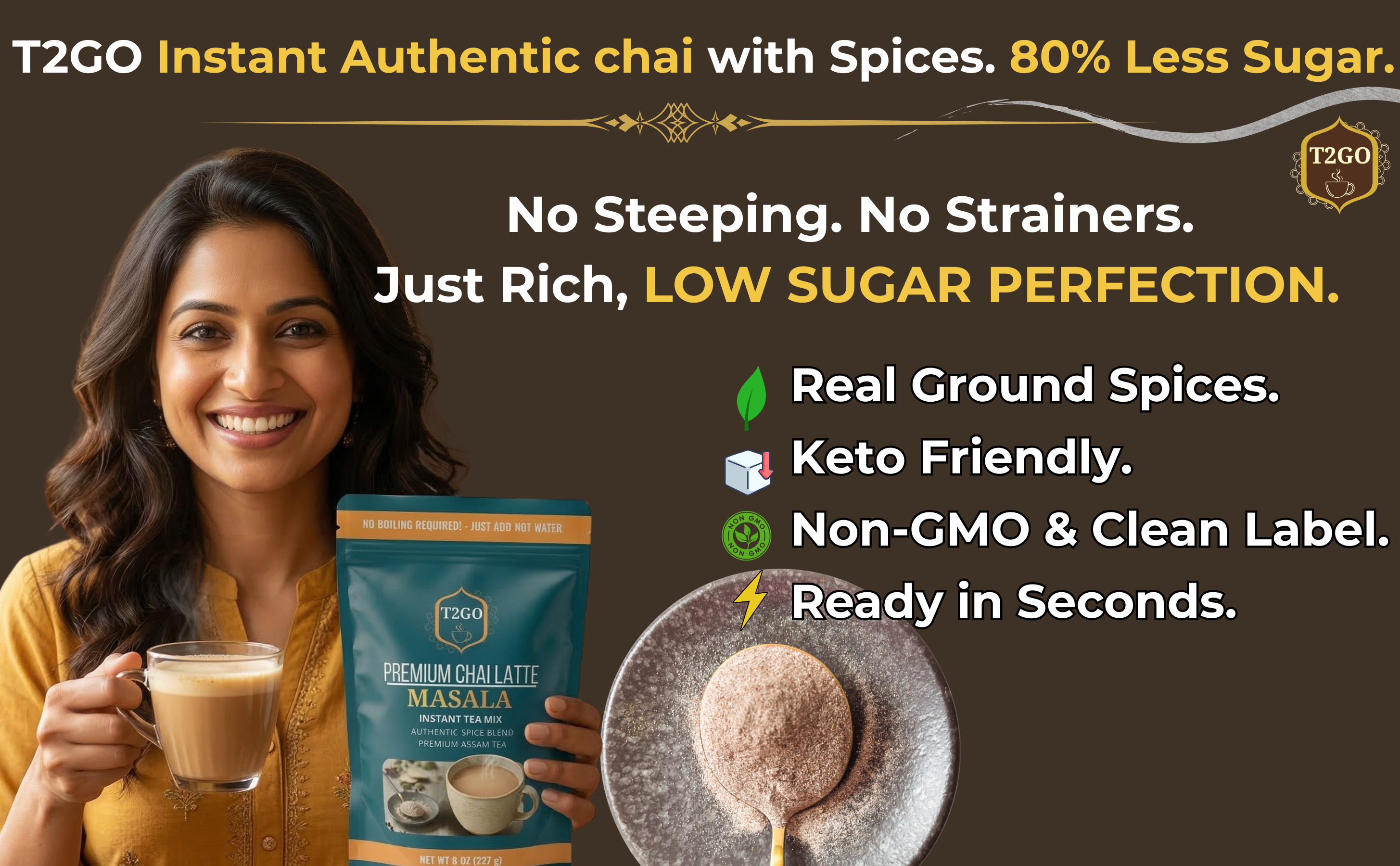 SHOP BEST SELLERSExperience the bold, spicy kick of Authentic Indian Masala Chai without the wait. No boiling, no straining, no mess. Just add hot water for a barista-quality spiced tea latte that fits your busy lifestyle. 100% natural spices, zero hassle.